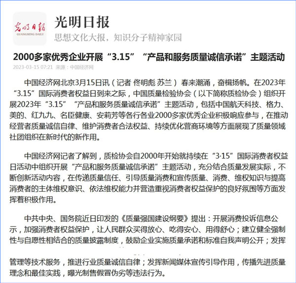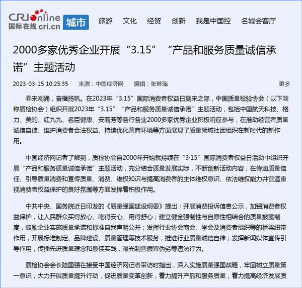 中國經(jīng)濟(jì)網(wǎng):2000多家優(yōu)秀企業(yè)開展“3·15”“產(chǎn)品和服務(wù)質(zhì)量誠信承諾”主題活動(dòng)